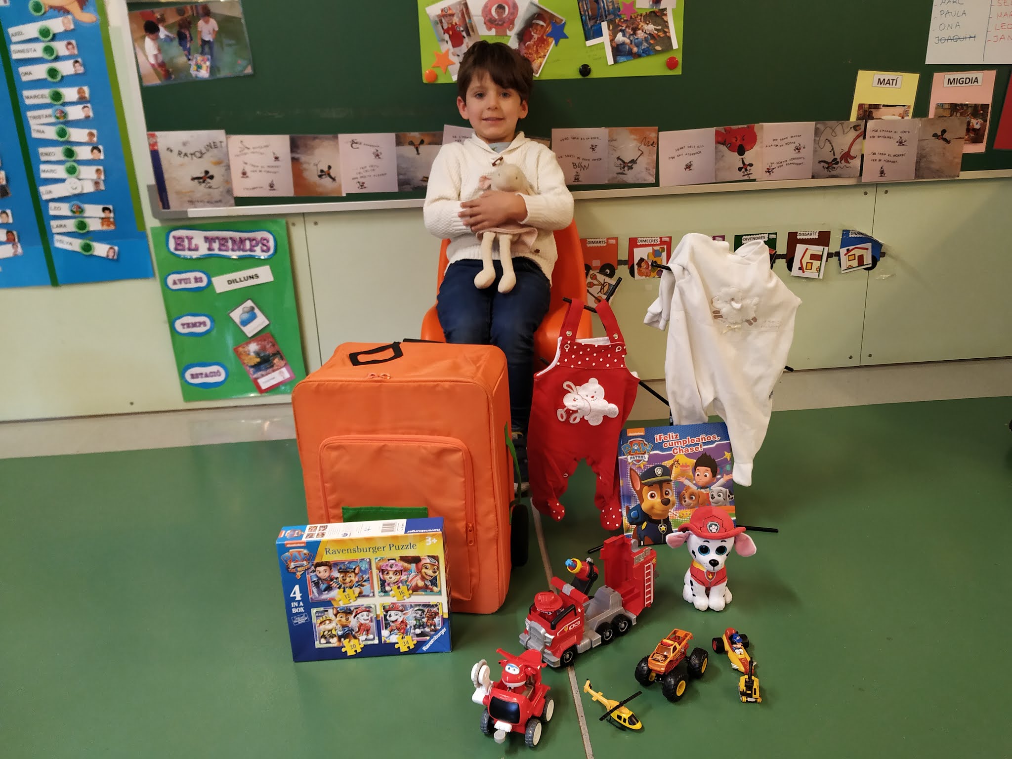 DINS LA MALETA, HA PORTAT ALGUNES JOGUINES PREFERIDES, UN CONTE, ROBETA DE QUAN ERA BEBÈ. COM VEIEU, A L'ENZO LI AGRADA MOLT LA PATRULLA CANINA.